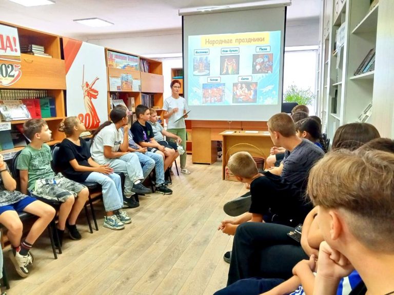 В преддверии Единого Дня фольклора в библиотеке для ребят с пришкольного летнего лагеря прошла игровая программа «По страницам русского фольклора». 🪆 Библиотекарь представила вниманию ребят