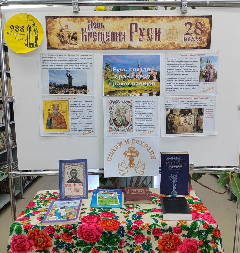 В библиотеке села Тихоречное в четверг, 24 июля, была оформлена книжная выставка «Русь святая. Храни веру православную», посвящённая Дню Крещения Руси. Экспозиция включает сборник литературы,